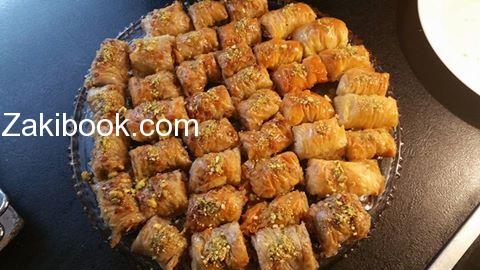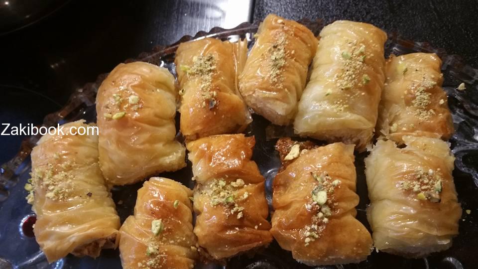 رقايق البقلاوة كل ورقة وحدة لحالها بدهنا زبدة وبرش عليها الجوز مطحون وبلفها زي السندويش وبزمها( زي اضمها على بعضها بالطول) وبقطعها وبحطها بالصينية مدهونة بالزبدة وبحمرها وبس تطلع بدلق عليها قطر.