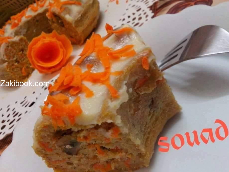 نضع الخليط في صينية الكيك المدهونة بقليل من الطحينة وندخله الفرن ونخبزه على حرارة ١٨٠ . نخرج الكيك من الفرن ونتركه حتى يبرد ونزينه بصوص الجبنة والجزر المبروش.بالعافية