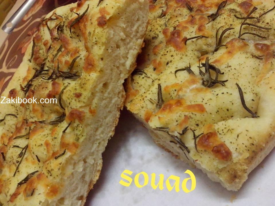 ندهن وجه العجين بزيت الزيتون ونخرم بطرف الاصابع سطح العجينة ونرش الوجه بزعتر اوريغانو وبهارات ايطالية وروز ماري طازج (اكليل الجبل) وقليل من جبنة الموزريلا المبروشة.