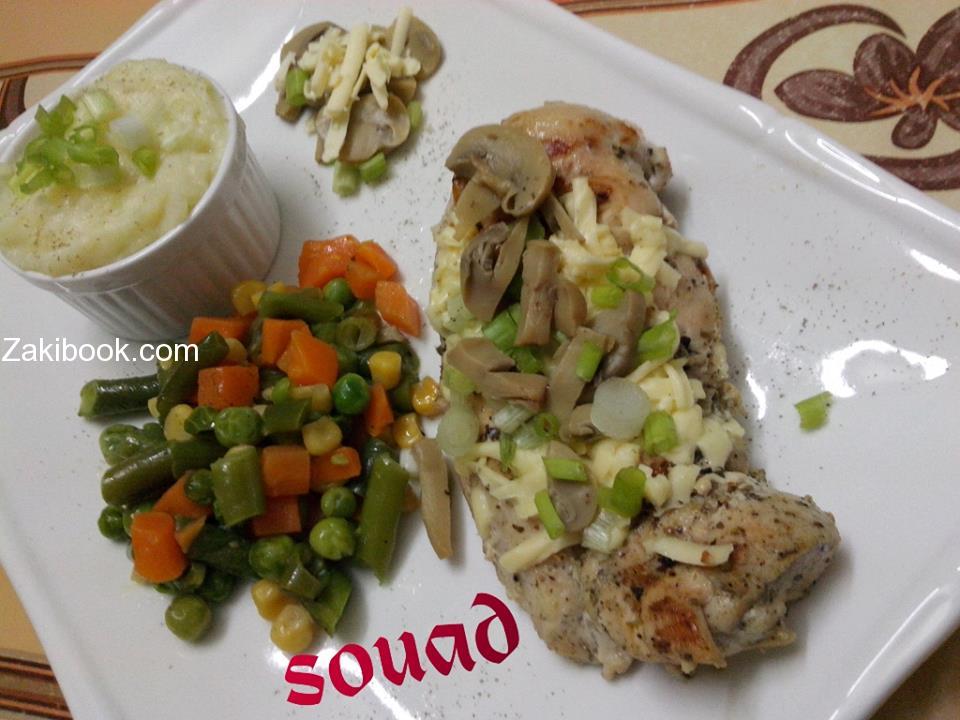 قبل الاستواء ب١٠ دقائق نضع الجبن ونتركه الجبن قليلا ليسوح. نضع صدور الدجاج في طبق ونزين الوجه بالبصل والفطر.