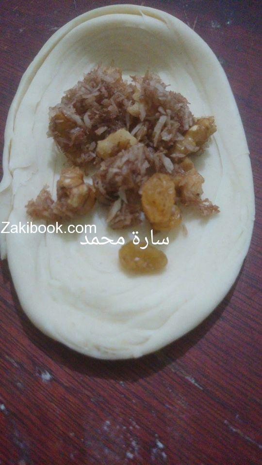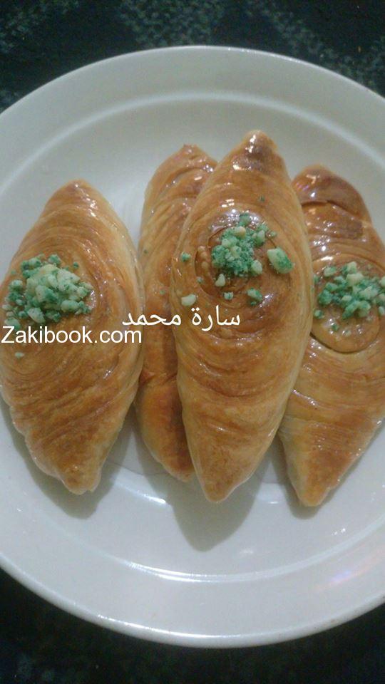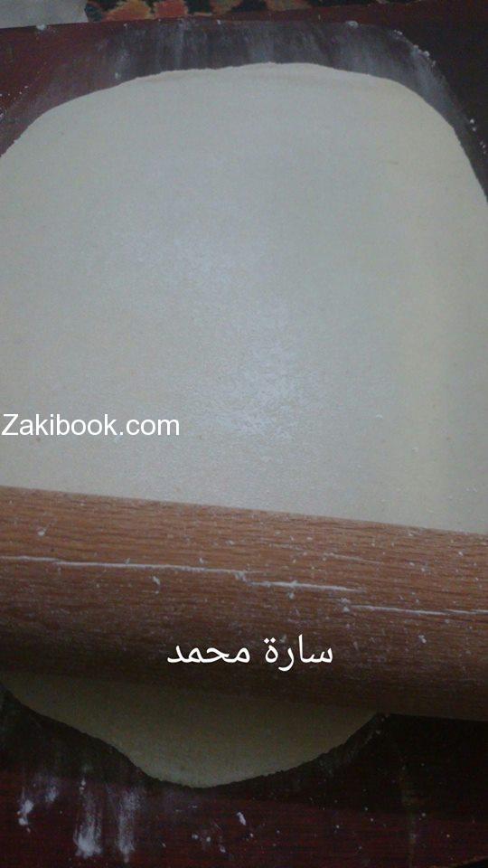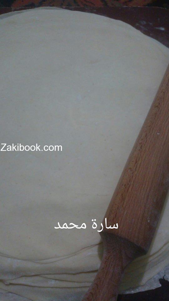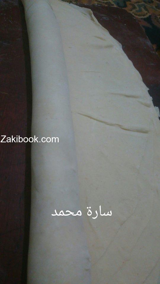 وبعدين بنقطع كور صغيرة ونفردها تكون رقيقة ونعمل 12 وحده ونحطها فوق بعض وبنرجع نفردها مع بعض ونلفها رول ونقطعو ونحشيها مكسرات حسب الرغبه ونحطها بصنيه مدهونه زيت منيح او سمن وندهن الوجه كمان وتوضع بالفرن وتسقي ب شراب ثقيل بارد