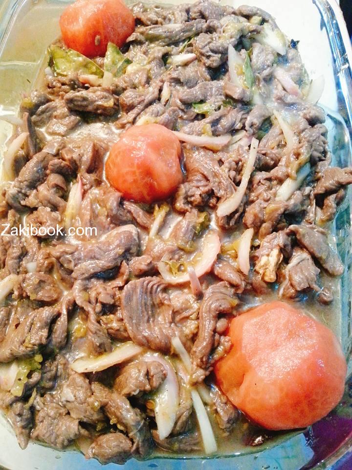 تنقع اللحمة في الخليط مدة 12 ساعة ويضاف بعض قطع الدهن
