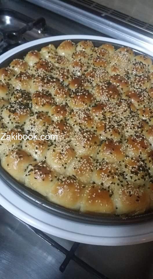 ثم نقطع العجين كور ونتركها 10 دقائق تخمر تانى في الوقت ده نقطع الجبن الكيرى ونبدأ نحشى كل الكور ونتركها 10 دقائق ترتاح في الصنيه وندهن الخليه بيضه مع رشه نسكافيه بالفرشه ونرش على الوجه سمسم والحبه السوداء