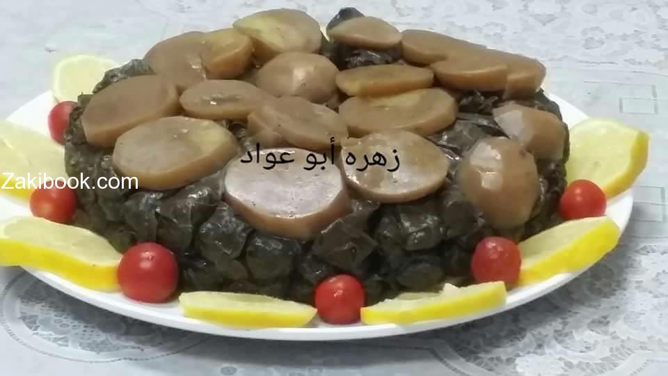 نقلب ورق العنب في صينية واسعة، نقدم ورق العنب مع شرائح الليمون