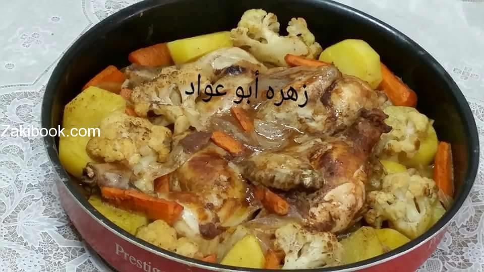 في الصينية حطي الدجاج مع كل الخلطه وحطي الخضار وغطي الصينية بورق ألومنيوم ودخليها الفرن حتى تستوي شيلي الورق وحمريها من فوق وصحتين وهناء ادمن زهرة ابو عواد