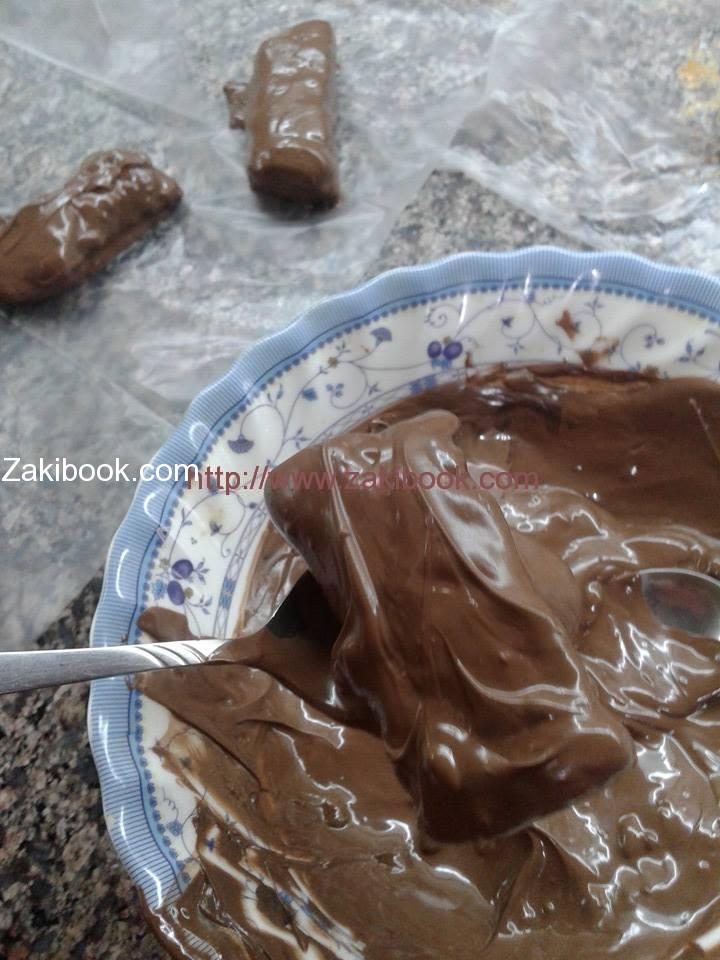 4 – نذوب قطعة الشوكولاته الباقية ، ونخرج السنيكيرز من الثلاجة ، ويقطع أصابع ، ثم يغمس في الشوكوﻻته الذائبة ،ويترك حتى تجمد الشوكولاته، وألف صحة وهناء أحلى سنيكرز بيتي .