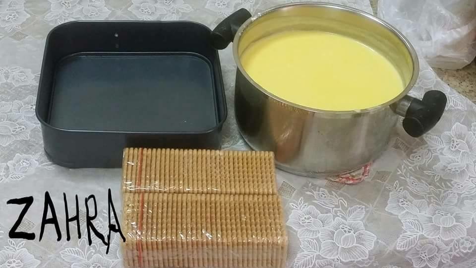 حطي بالقالب شوية من الخليط وبعدين طبقة بسكويت وطبقه من الخليط وأخرى من البسكوت لحد الانتهاء من الكمية وبعدين حطي بالثلاجة عده ساعات