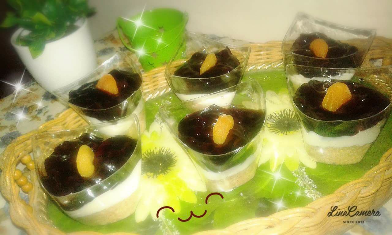 300 غرام جبنه كريميه او 16 حبه جبنه كيري مع 4 ضرف دريم ويب ونص كاسه حليب بارد بتخفقيهم بالخفاقه وبضيفي 2 علبه قشطه كيمر وبتكملي خفق وبتحطي معلقتين جلاتين مع نص كاسه ماء وبتتركيه يتفتح بتحطي جلاتين 10 ثواني فقد في المكرويف ليدوب وبتحطي ع الخليط وبتخفقي شوي وبتحطي هادالخليط،فوق البسكويت و ع تلاجه 3 ساعات وبتجيبي علب فواكه كرز او توت او فروله بتحطيه عالوجه وبس صحتين