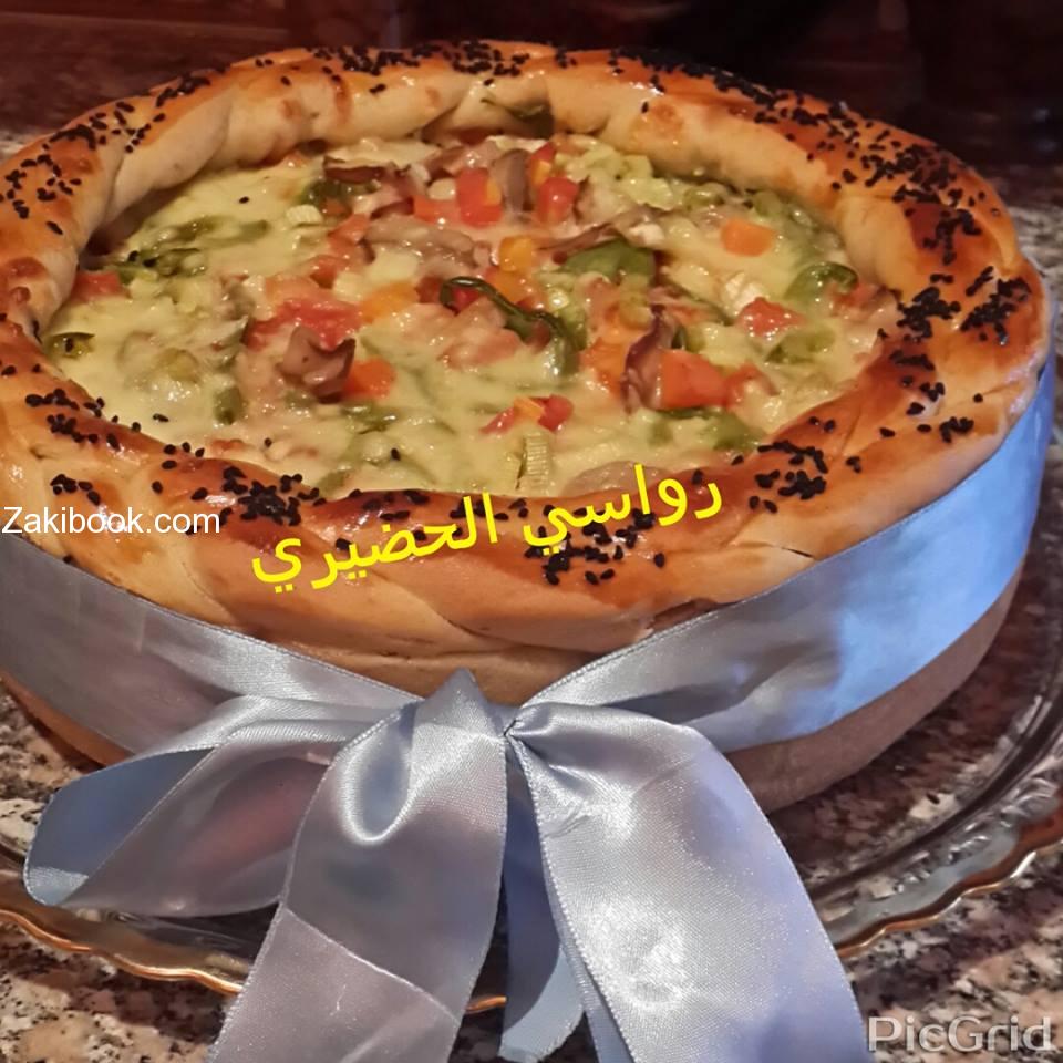 وبعدين بنحط خلطة البيتزا العاديه متل الزتون والفلفه وحلقات بصل وصوص ومكعبات جزر بيكون الجزر مطبوخ مسبقا في مي وملح ونعمل ظفره متل الجديله ونلفها بجوانب القالب وندهنها بصفار بيض ونقطة خل ونرش حبة البركه وندخلها الفرن