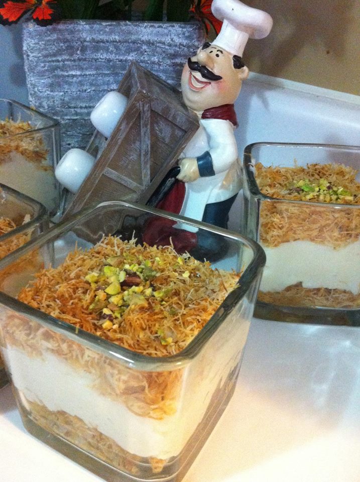 هلا بس تبرد القشطة تمام منعمل طبقة كنافة ومنحط عليها شوية قطر بعدين منضيف طبقة قشطة
