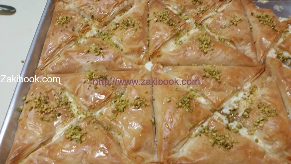 – البكيت الفيلو بعد كم ورقه و بقسمه بنص مثلا لو كان 20 ورقه بقسم 10 ,10 و بعدا بقسم كل 10 الى 2 أو 3 مستطيل حسب كبر الورقه و بعدا كل مستطيل بقسمه إلى 3 مربعات و بحط الحشوه بل نص كل مربع و نثنيه من فوق و سكريه مشان تعملي مثلث و حطيه في صنيه لا تشكلي مثلث كبير, و حطي سمنه على فوق كل حبه.