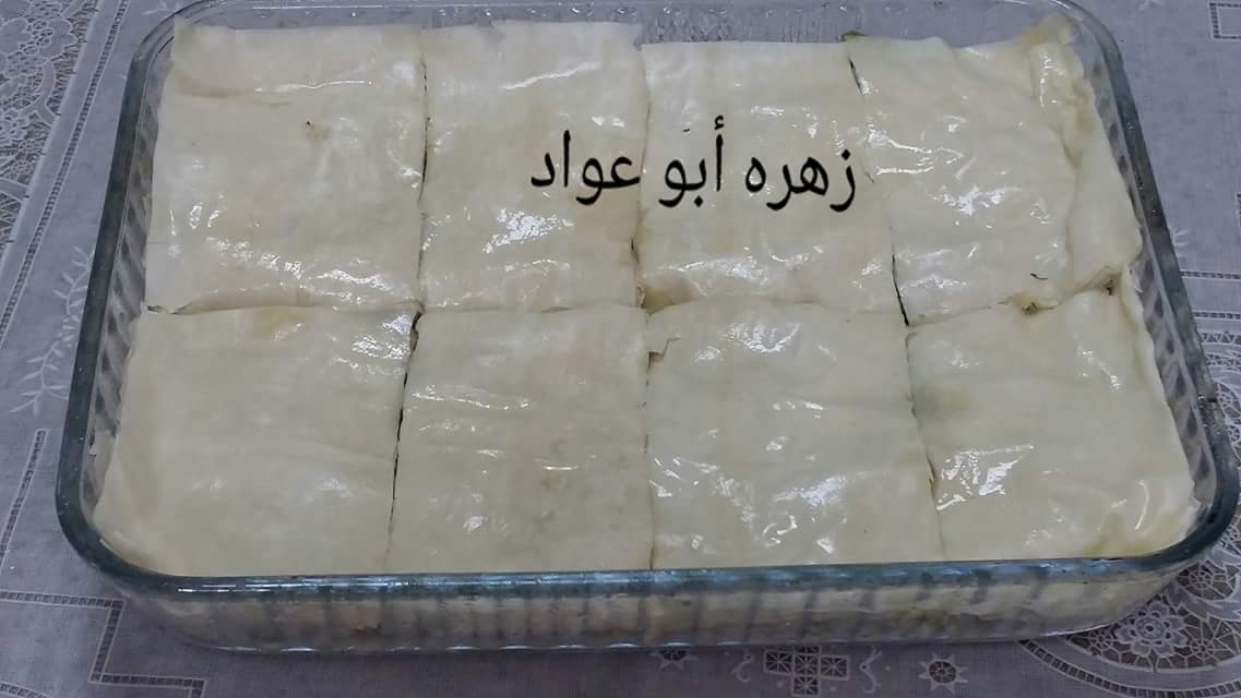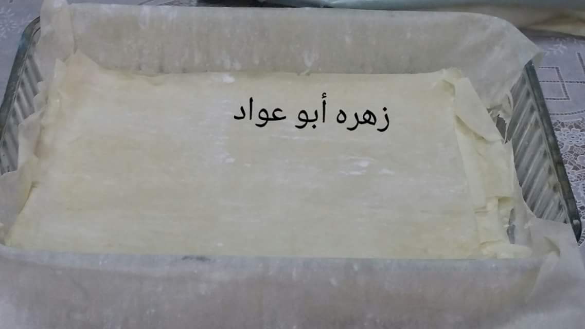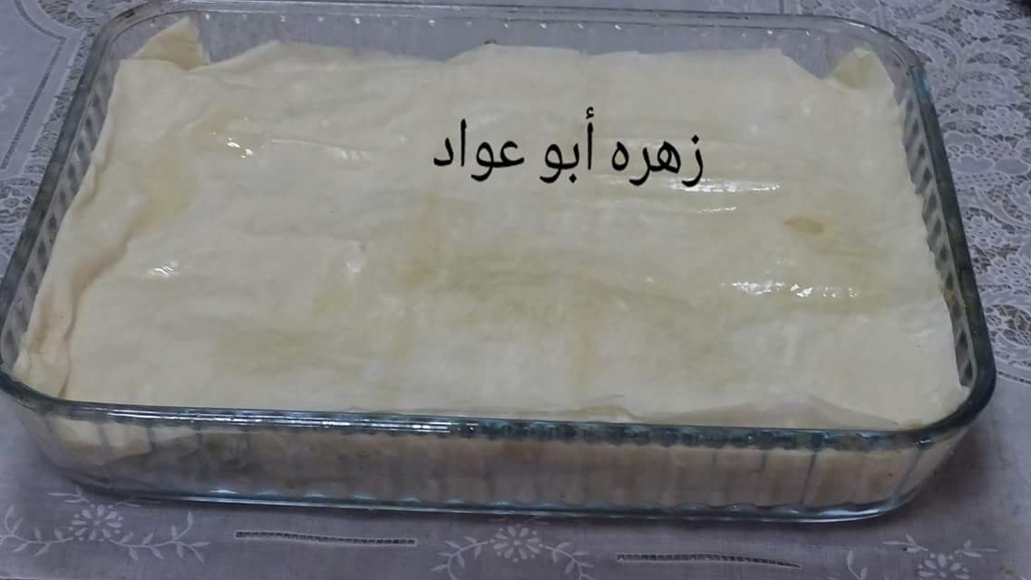 وخذي أربع ورقات وادهني بين الطبقات زيت حطي نصف الكمية وبعدين ضيفي الحشوة وحطي باقي كمية الجلاش مع دهن الزيت بين الطبقات