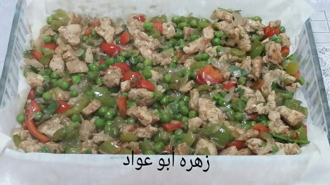 وبعدين ضيفي الفلفل الأخضر والأحمر والبازيلا وخليهم يستوا مع بعض وضيفي الملح والبهارات وحطي البقدونس المفروم ادهني الصينية بشويه زيت