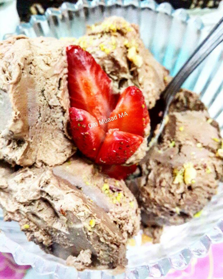 بوظة الكريمه بشكولاتة كاستين كريمة ،،ونصف كاسه حليب مكثف،،وملعقتين كاكاو بودر،،نخفق الكريمة لين يبدا الخليط يتماسك ونظيف الحليب المكثف بتدريج واذا تردو الطعم حلو زيادة اظيفو لها سكر مع الكريمة واخر شي اظيفو الكاكاو بودر ونحطه بقالب وعلى الثلاجه شي ٨الى ١٠ساعة ،، وزينتها بلمكسرات وبالعافيه