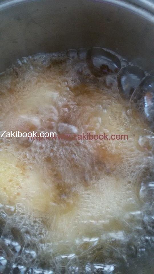 6 – في زيت غزير وحامي ، تقلى أنصاف البطاطس المحشية ، وتحمر من كلا الجهتين ، ثم نضعها فوق ورق نشاف .