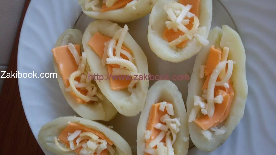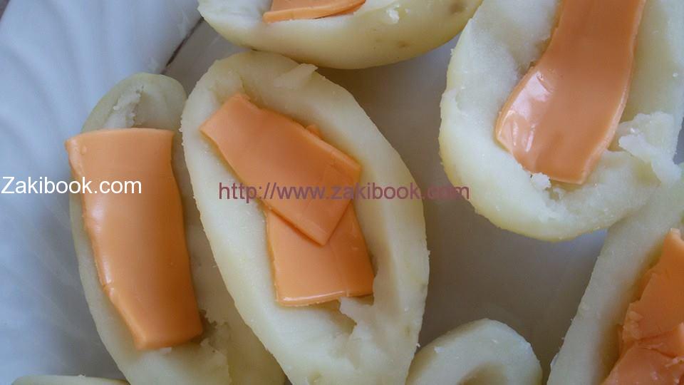 4 – نأخذ أنصاف البطاطس المحفورة ونضع وسطها القليل من الجبن المبشور والقليل من الموزريلا .