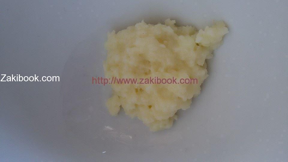 تصفى من مائها ، وتحفر في وسطها بملعقة صغيرة بحذر ومهل ، ونأخذ لب البطاطس الذي أزلناه من البطاطس ، ونخلطه مع خليط اللحم المفروم .
