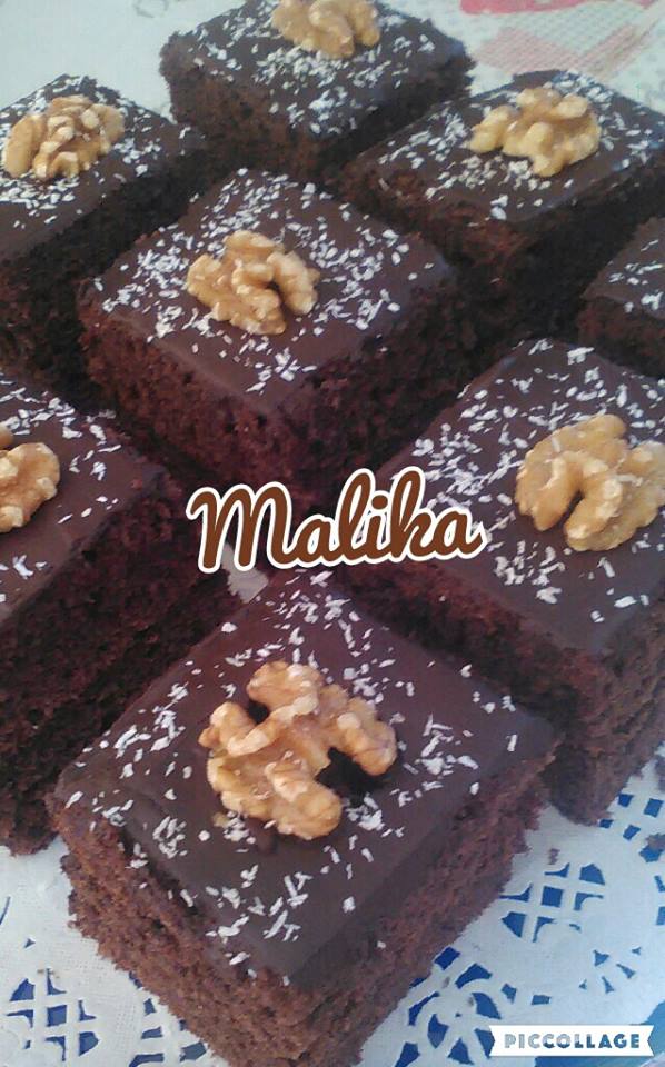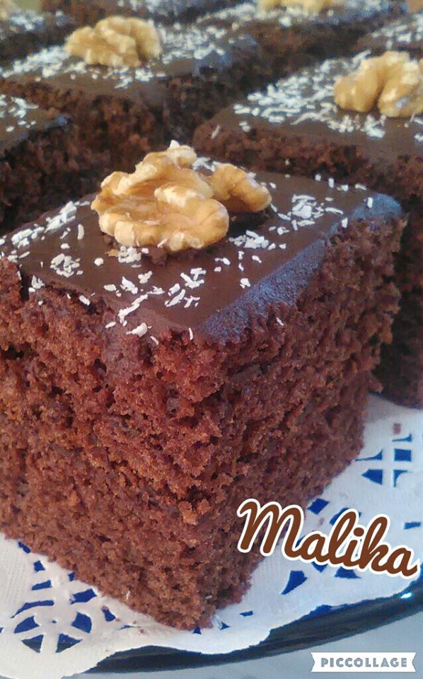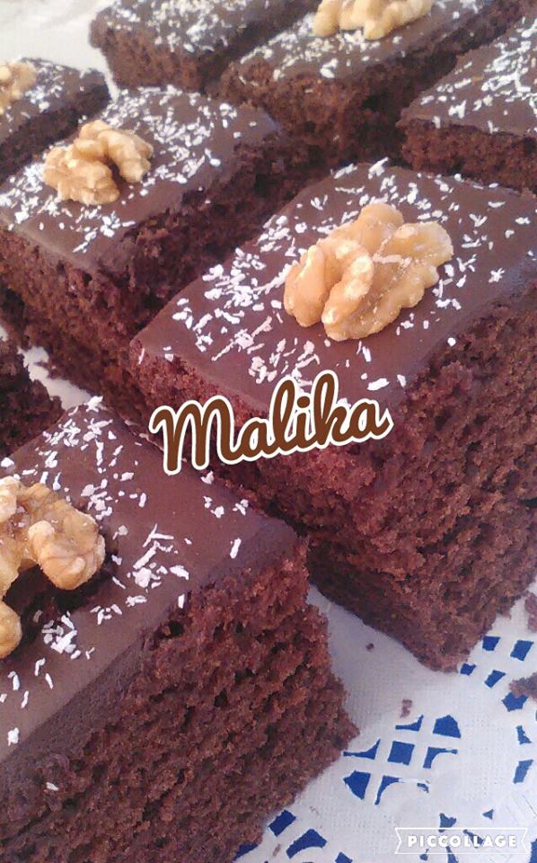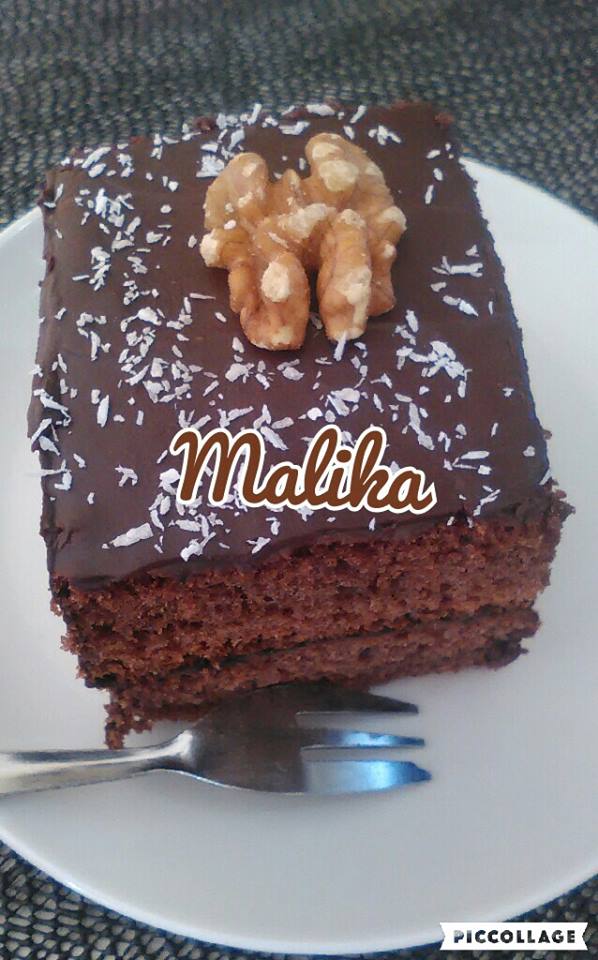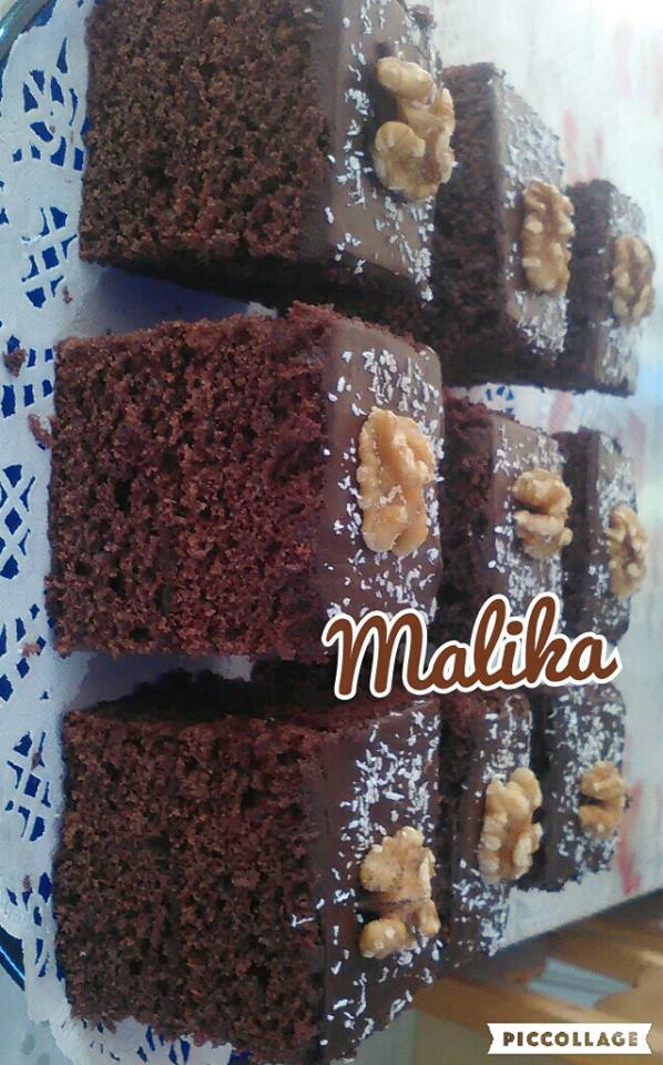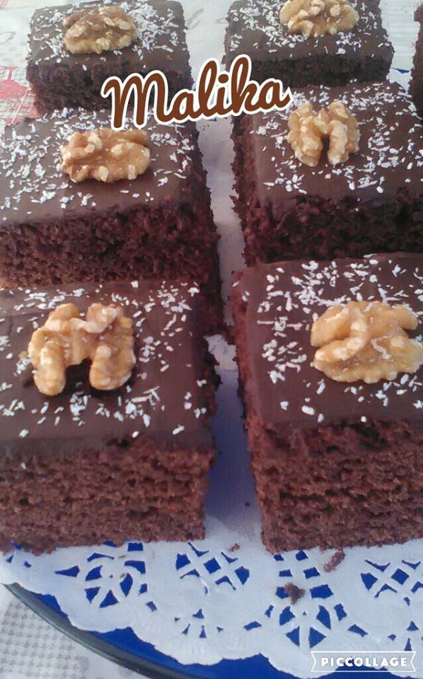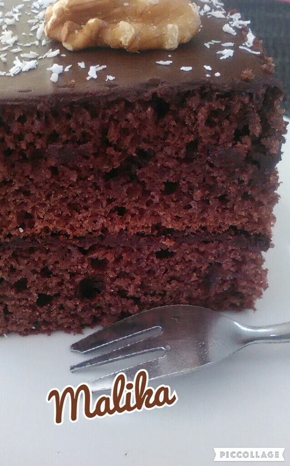 نقطع الكيكة الى قسمين نضع طبقة من الطلاء في الوسط ثم نغطي كل الكيكة بالطلاء المتبقي نتركه ترتاح ثم نقطع الكيكة ونزينها بالجوز و جوز الهند