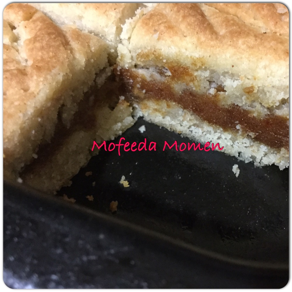 تعجن في اليوم الثاني بالماء الدافيء وتفرد في صينية طبقتين وبينهما التمر المهروس