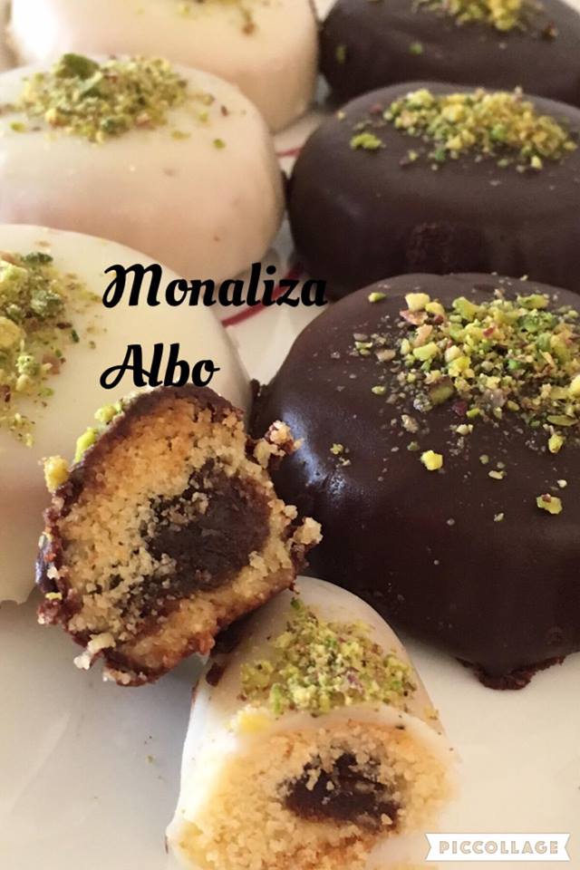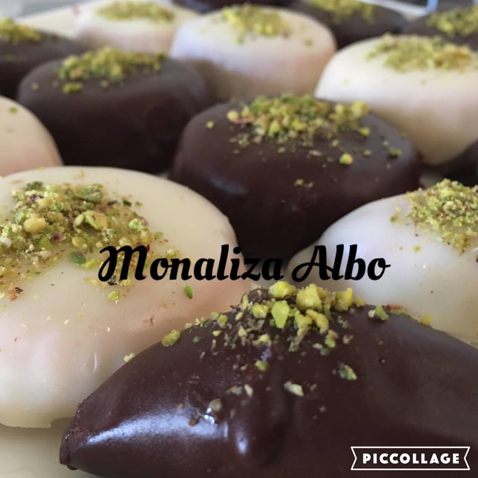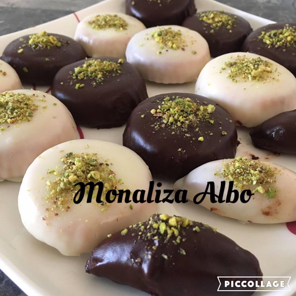نجهز التغليفه كاسة صغيره شكولاته بيضاء خام كاسة صغيره شكولاته سواد خام بنحطها كل نوع بوعاء صغير فوق حمام ماء وا نضيف فوق كل نوع ملعقتين زبده وا اربع ملاعق حليب سائل و نحركهم لاين تدوب وا تكون معنا تغليفه بنوعين نغطس المعمول فيهم وا بنحطهم علئ شبك إمشان الشكولاته الزئده تنزل وا نرش فستق وا لاين تجمد معنا نضع في صحن التقديم Monaliza Albo