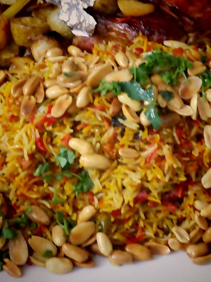بننقع الرز البسمتي مدة نص ساعه بماء ساخن كي يتمدد في طنجره فيها زيت بهارات حب مشكله قلبيهم شوي ثم قلبي راس بصل مفروم ناعم مع قرن فلفل احمر او اخضر