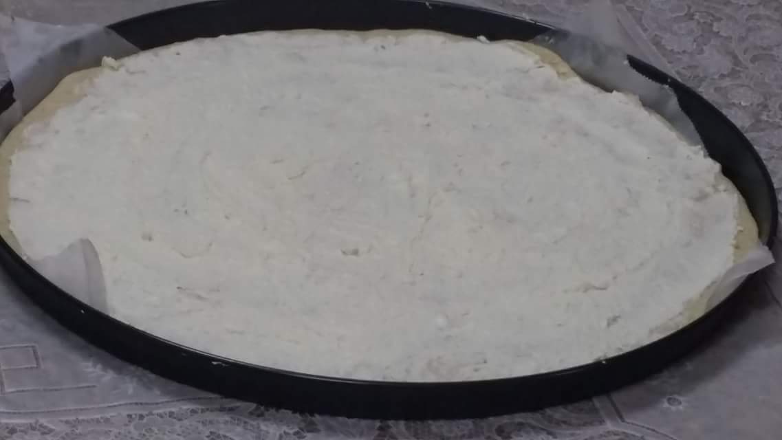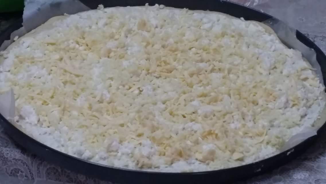 افردي العجينه وحطي على صينية الفرن وادهنيها بالبنه وبعدين ابرشي أنواع الجبنه وحطيها على الفطيره ودخليها الفرن لحد ما تستوي