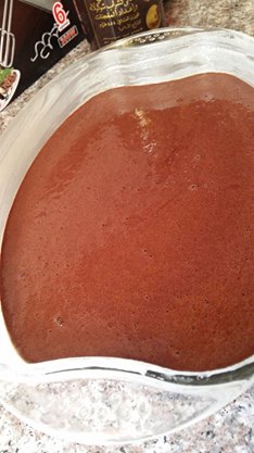اولا نخفق بيضتان مع ملعقة كبيرة فانيلا حتى يتضاعف حجمهم نضيف نصف كوب زيت و كوب و نصف سكر و نستمر بالخفق على اعلى سرعة لمدة دقيقتان ثم نضيف كوب حليب سائل و خمس ملاعق كبيرة كاكاو منخل و نستمر بالخفق .