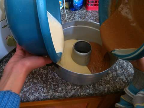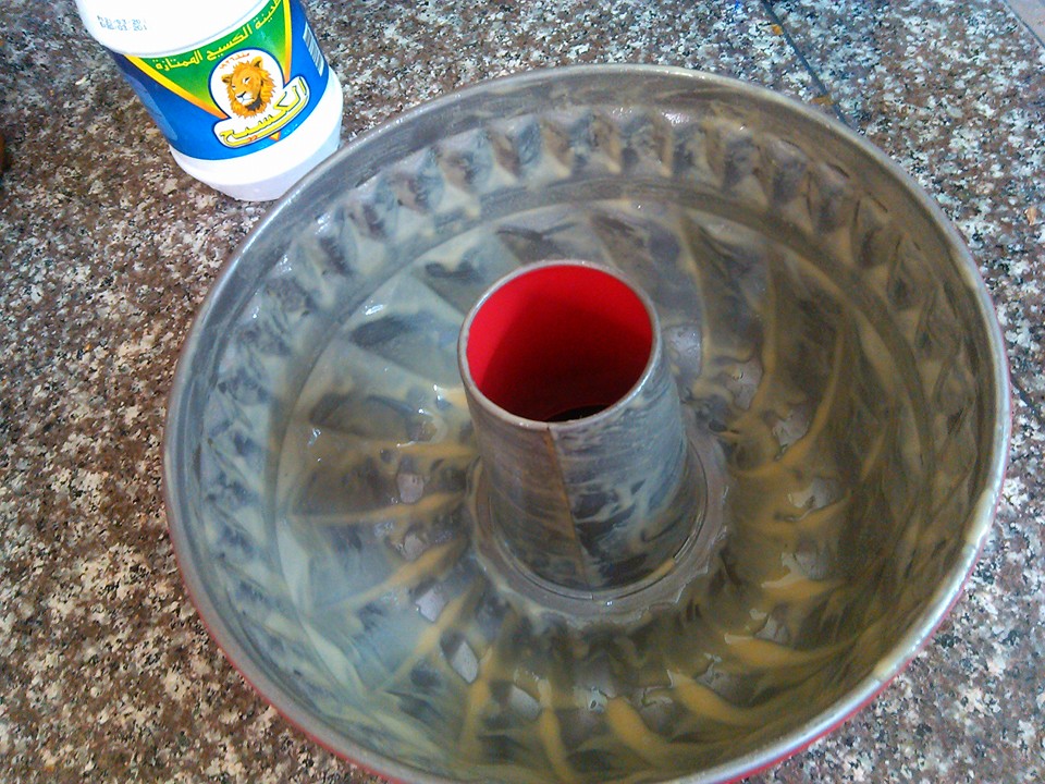 بنكون بهذا الوقت محمين الفرن على درجة 180 وداهنين القالب طحينية بيعطي الكيكة لون ذهبي