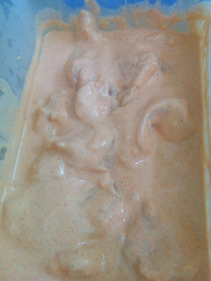 بنحضر 4 ملاعق لبن زبادي وملعقتين خل كبار وبابريكا حمرة حارة وفلفل أسود وملح ودبس الرمان وكاسة إلا ربع طحين وبودرة ثوم وبودرة بصل وسن ثوم مدقوق وبيض ونصف كاسة نشا كبيرة وكاسة إلا ربع ماء, بنخفقهم مع بعض يدوي, و بنحطهم على الدجاج وعلى الثلاجة لمدة 6 ساعات,