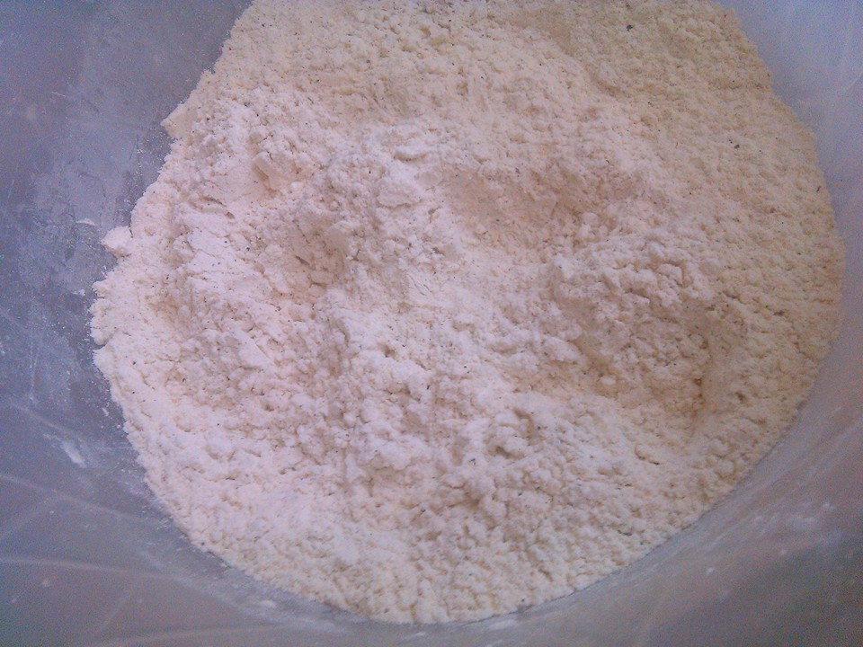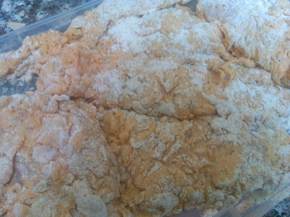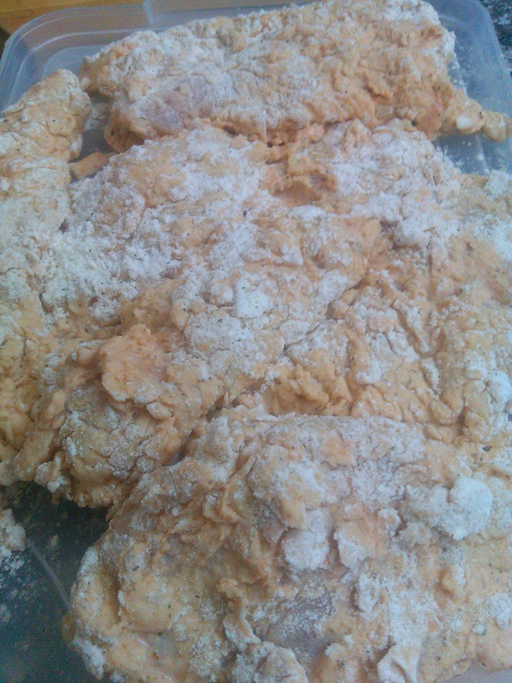 كاسة ونصف طحين وملح وفلفل أسود وملعقة ونصف زنجبيل بودرة هلا بنطالع الخلطة وبنصير نغطس الدجاج بالطحين, بعدها بنرجعا على الخلطة وبعدها على الطحين وبعدها بزيت حامي وغزير على نار هادية