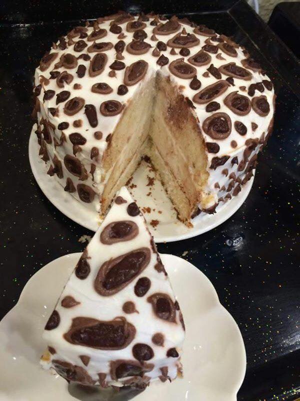 حبايب هاي كيكة عادية مقاديرها ٢ ونص كوب طحين / كوب ونص شكر/ نص كوب زيت / ٢ كيس بيكن باودر/ كيس فانيلا/ حليب كلاص تقريب او اكثر / ٣ بيضات / والتزيين بسيط جدا كريم شانتيه ابيض غلفت بيه الكيكة ووراها سويت دوائر صغار وكبار كريم شانتيه كاكاو بودرة والحواف كاكاو بودرة أكثر منه حتى نحصل على هذا الشكل مال جلد النمر)?
