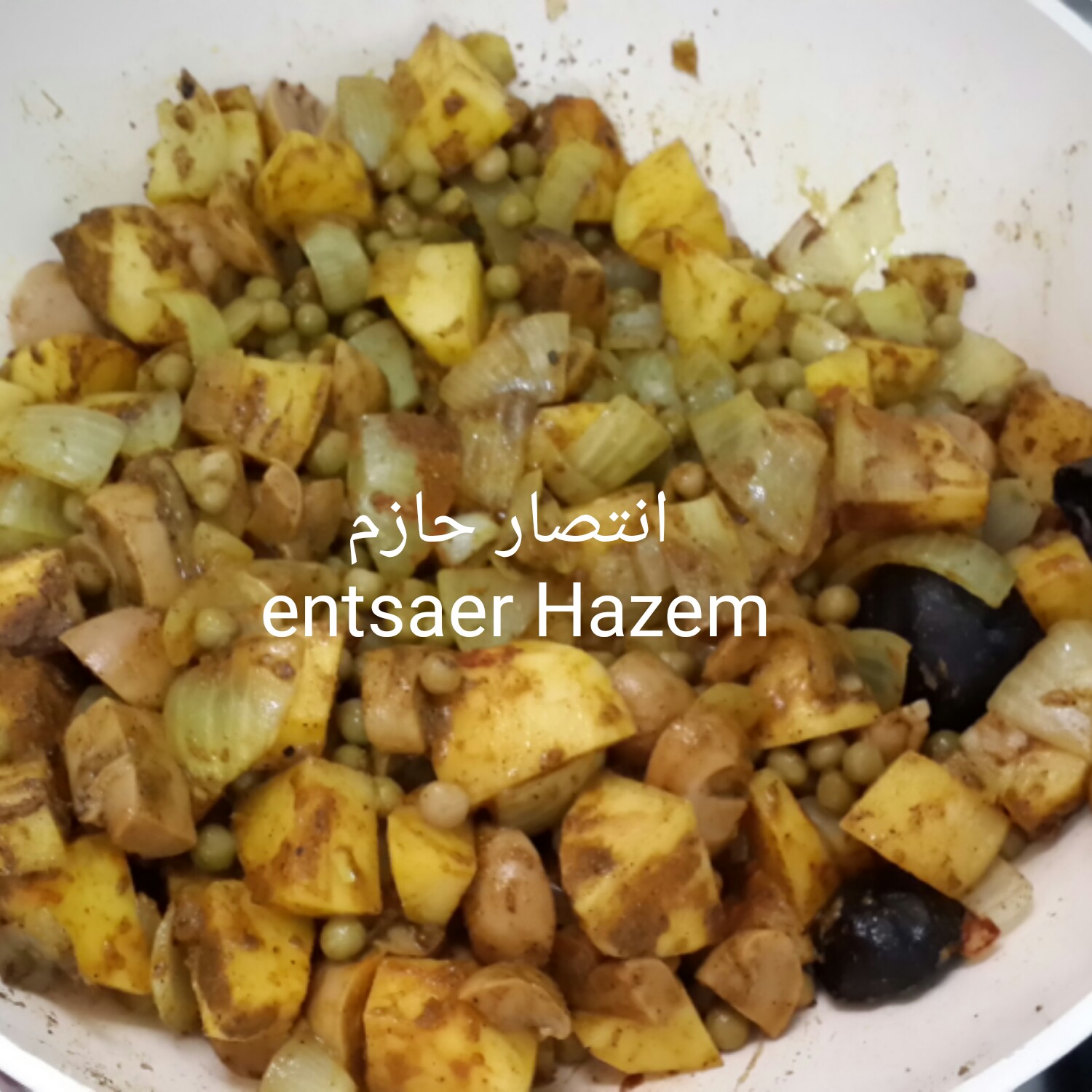 - في مقلاة نضع 3 ملاعق زيت ونقلي البصل والثوم إلى أن يذبل البصل ثم نضع البطاطة ونقلب ثم الفطر والبزاليا ونقلب ثم نضيف كل البهارات ونقلب كل المكونات
