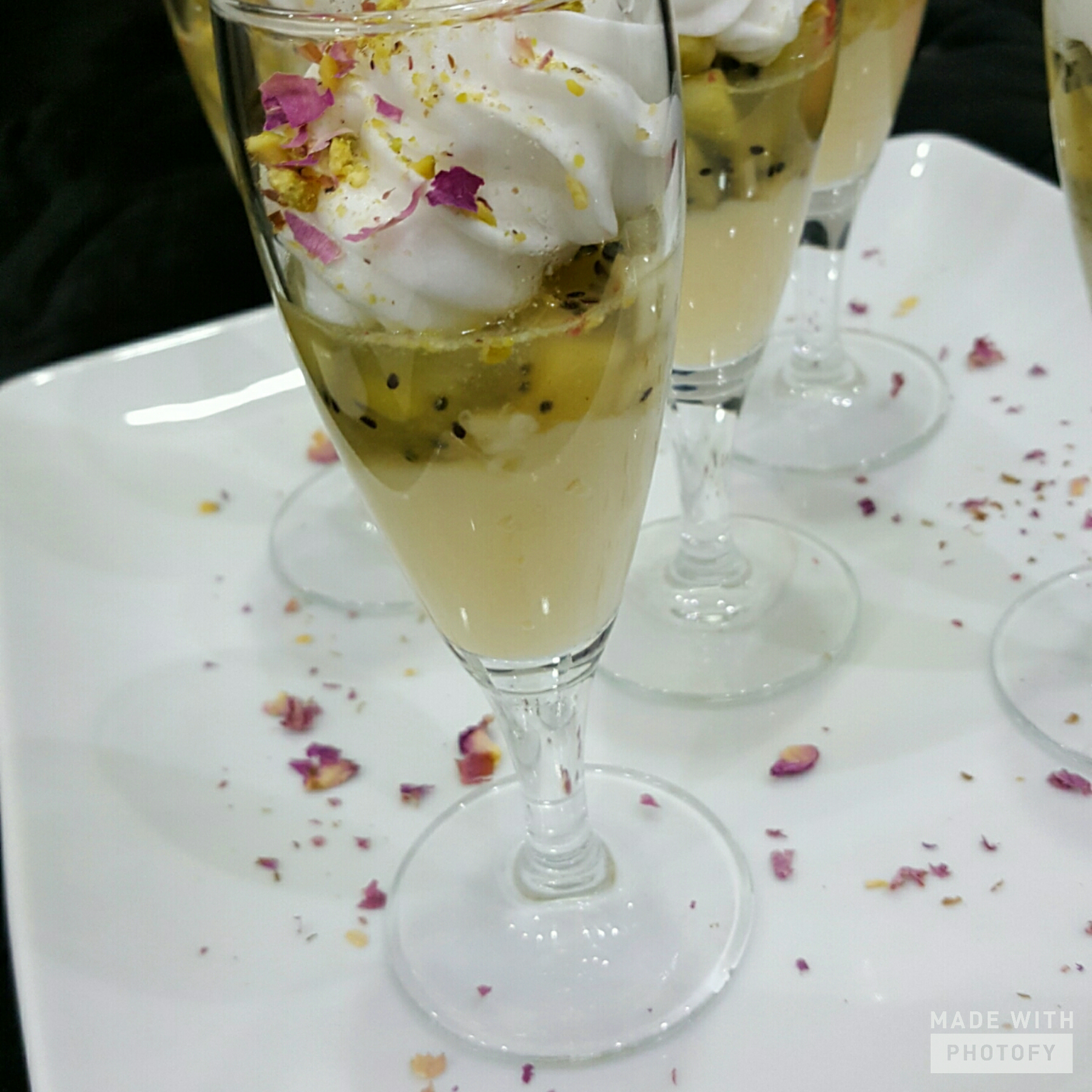 نكون مقطعين الكيوى قطع صغيرة ونحطة علة النار مع قليل من السكر لمدة 5دقايق نطلع الكاسات ونحطة على وش الكريمة ونحط على وشة روزتات كريمة شانتية ويزين من اعلى بالفستق