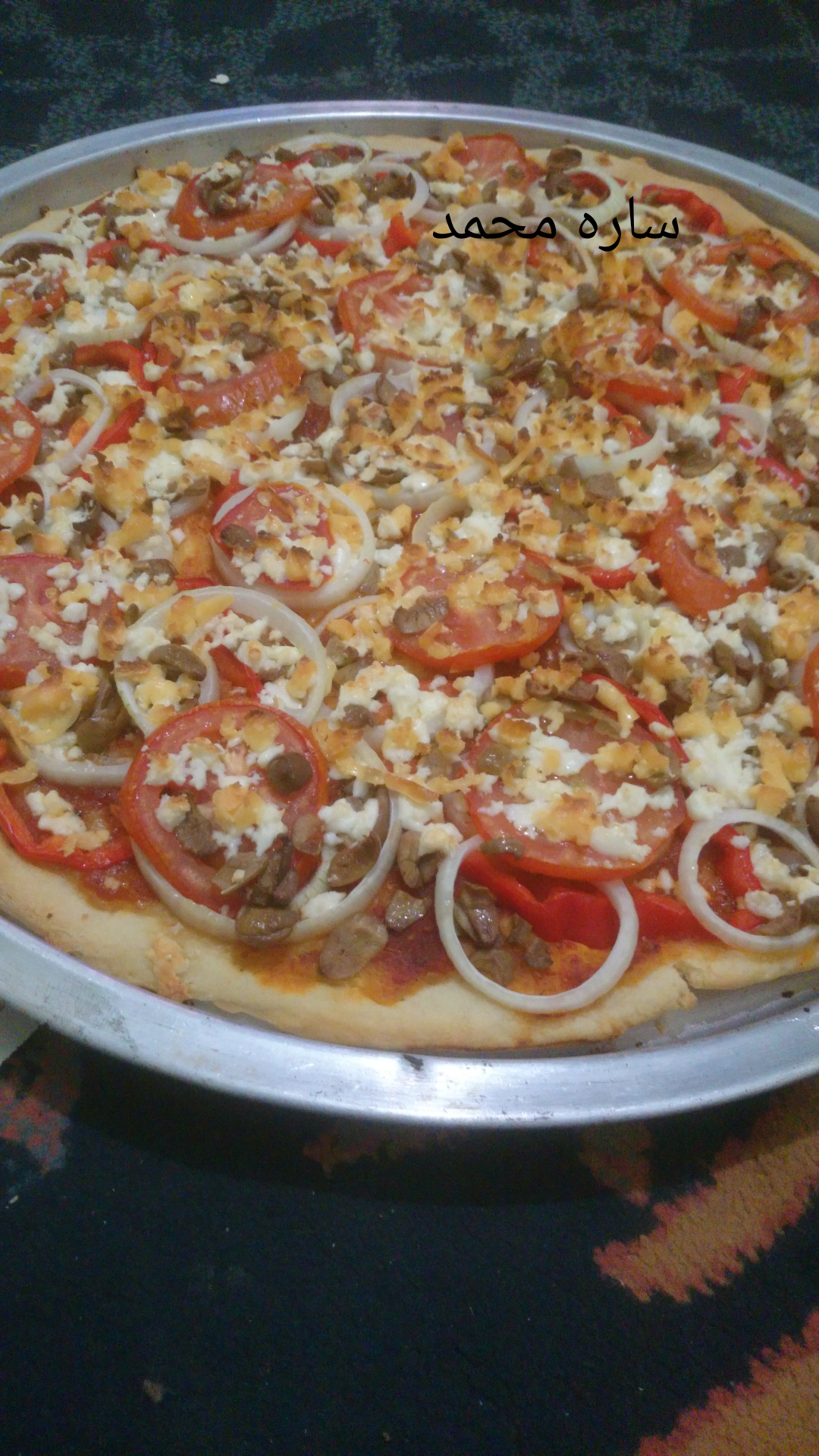 وبعدين نضيف عليهم زعتر ناشف وناخد العجينة نفردها حسب الرغبه انا عملتها كبيرة ونفرد عليها الصوص وجبنه اي نوع عندك وبعدين شرائح بصل وبندوره وفلفل وبعدين جبنه كمان وع الفرن وصحتين وعافية يارب