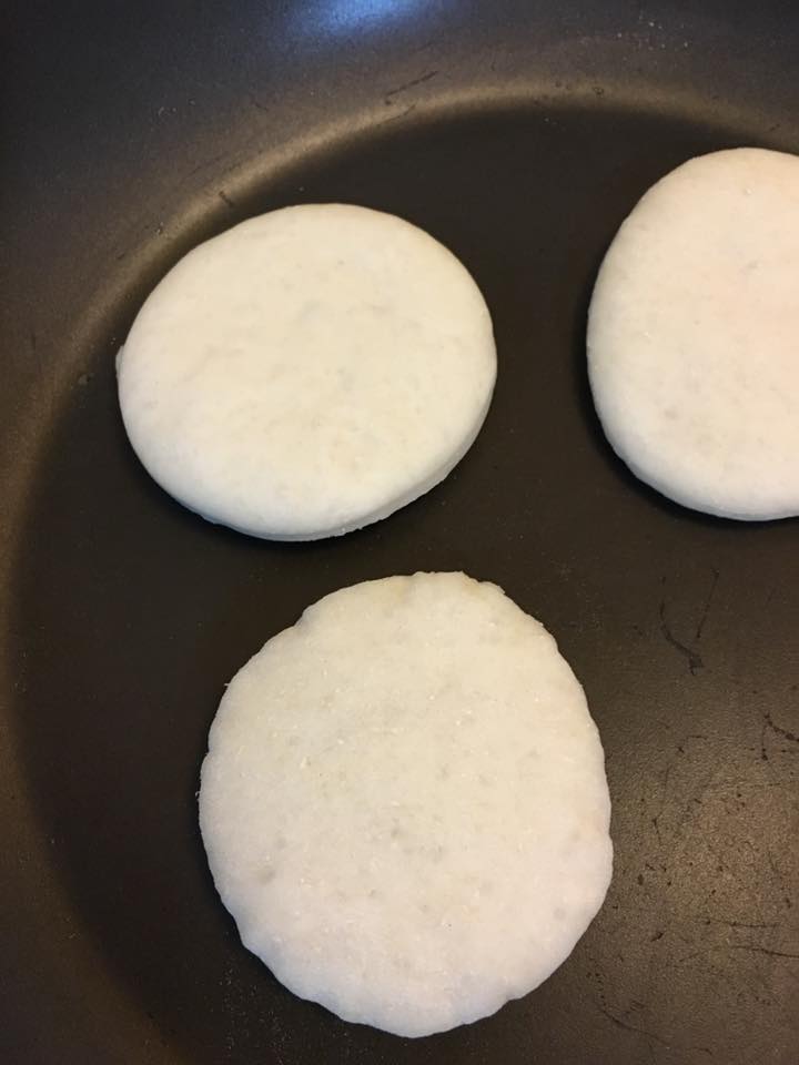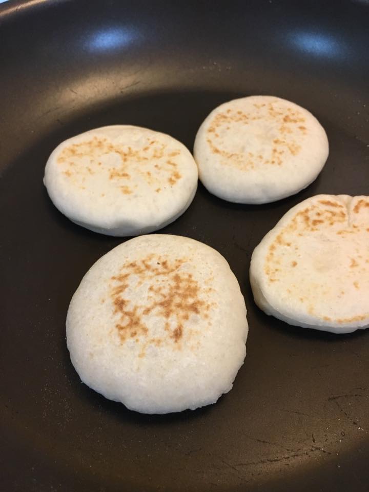 ٣ كاسات طحين ملعقتين حليب بودرة ملعقة كبيرة سكر ملعقة ملح ملعقة خميرة كبيرة وملعقة زيت كبيرة ماء دافئ للعجن كل المواد ضعوها سوا وحركهن منيح بعدين ضيفي المي حتى تتشكل عجينة لينة ما تلزء باليد ماتكون العجينة قاسية لينة هلا منتركها تتخمر نص ساعة بعدين انا فردتها وقطعتها بالقطاعة بحجم الدونات وغطيتها وتركتها نص ساعة تتخمر وبعدين بالمقلاة على نار جدا هادية وصحتين ممكن تحشوه باي حشوة وممكن تاكلوهم للفطور للعشا وممكن تفرزوهم كمان خبز بيجنن ديما بعملو لأولادي وصحة وهنا
