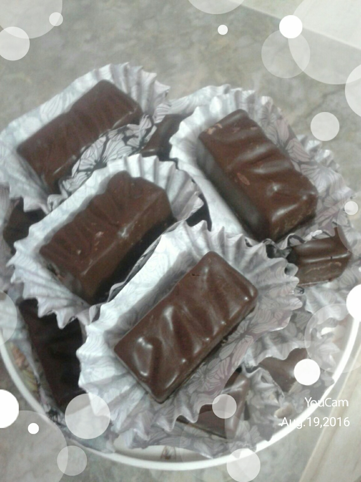 نقوم بوضع الشوكولاته على حمام مائي .خلال ذلك نقوم بخلط الجوز هند مع الحليب المكثف لغاية ان يتماسك نحضر قالب السيلكون ونقوم بطلاء كل مربع على حدا بالشوكولاته السائحة ونضع القالب خمس دقائق بالثلاجة وبعدها نقوم بوضع مزيج الجوز هند بقالب السيلكون وبعد الانتهاء من ملئ القالب نقوم بوضع الشوكولاتة على كل قطعه ويدخل الثلاجة لمده نص ساعة وصحتين وعافبه