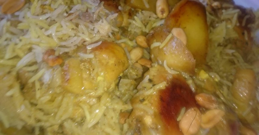 [ ] دجاجه منزوعه الجلد ومقطعه ثمان قطع حبّتان من البطاطا مقطعه ومقليّة. اربعه أكواب من أرزّّ بسمتي المغسول والمنقوع لمدّة نصف ساعة. حبّة بصل مفرومة فرماً ناعماً. رأس من الثوم المفروم فرماً ناعماً ملعقة كبيرة من الهال المطحون. نصف كوب من اللبن الرايب.