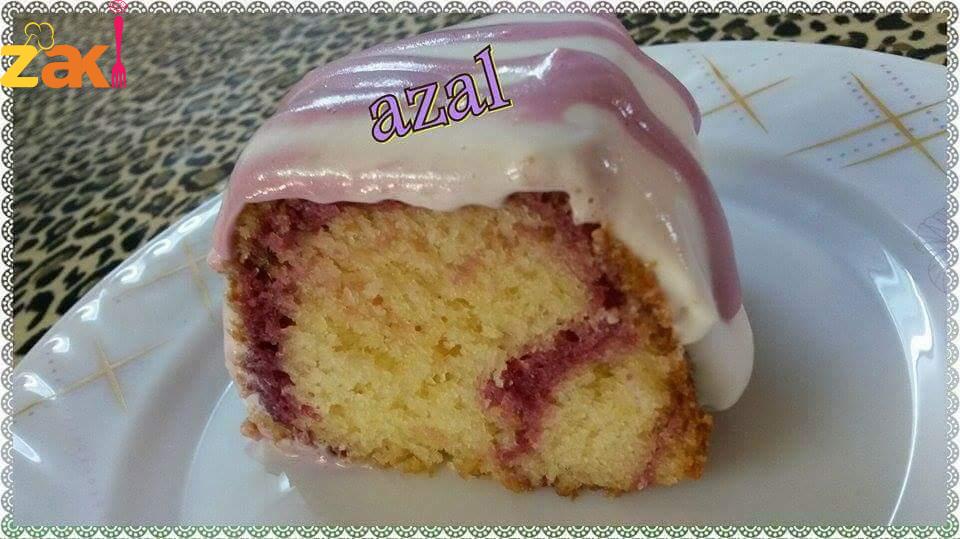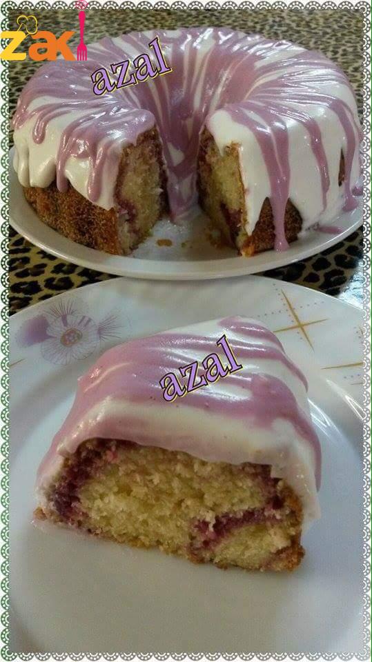 نخفق ثلاث بيضات ثم نضيف كوب لبن رائب ،فانيلا، كوب سكر ،نصف كوب زيت،ثلاث اكواب طحين مضافا اليه البيكن باودر،مع الخفق جيدا بعد كل اضافة،نأخذ بقدر كوب من العجينة ونضيف اليه صوص التوت وقطرة من صبغ الطعام نفس اللون ويخفق،