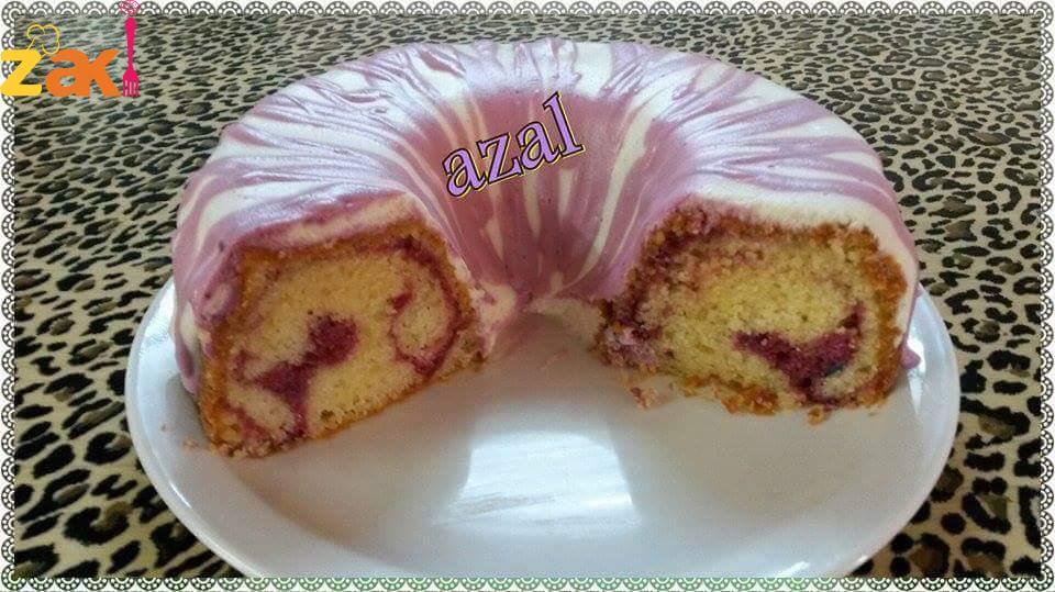 ندهن القالب بالطحينية ثم نسكب نصف كمية الخليط ثم نوزع خلطة التوت ثم نسكب باقي العجينة يدخل الفرن حتى تنضج تقلب في صحن التقديم وتبرد،ثم يوزع على الوجه التلبيسة.