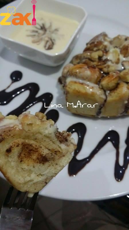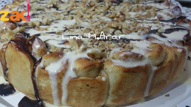 بنفرد العجينة وبنقطعها دوائر صغيرة بحجم فنجان القهوة بندهن كل دائرة بزبدة طرية مش مذابة وبنخلط سكر مع قرفة وبنحركهم بصحن وبنحطهم فوق الزبدة المذابة وبنكون داقين جوز ناعم جدا بنحط رشة خفيفة بنطبق الدائرة بهالشكل وبنضغط عليهم من النص بحيث يكون الجزء المسكر تحت والمفتوح من فوق وبنكمل بهالشكل بهالشكل لتتملى الصينية دهنت الوجه ببياض بيضة مخفقوق مع شوية فانيلا وع الفرن عاخفض درجة حرارة من تحت بالبداية لحتى تستوي وبعدها من فوق وبنزينها بالصوص الابيض والجوز المحمص الصوص الابيض : علبة حليب مكثف ومحلى مع 3 معالق قشطة و2 حبة كيري بنخفقهم منيح