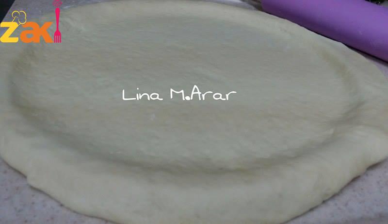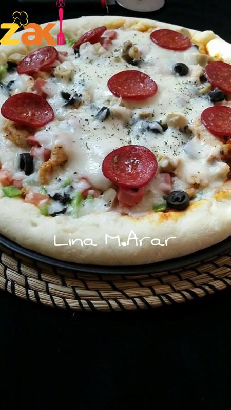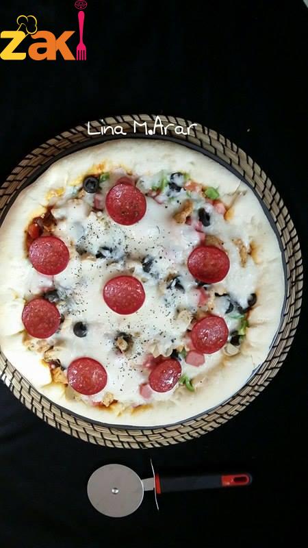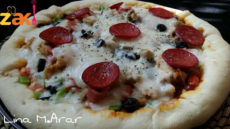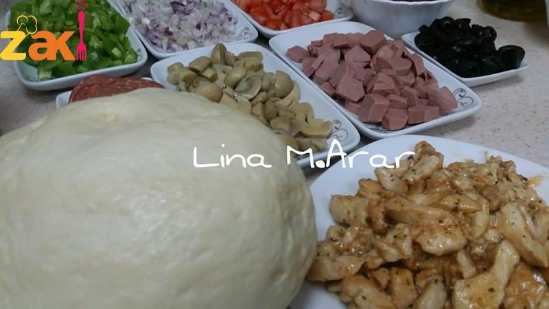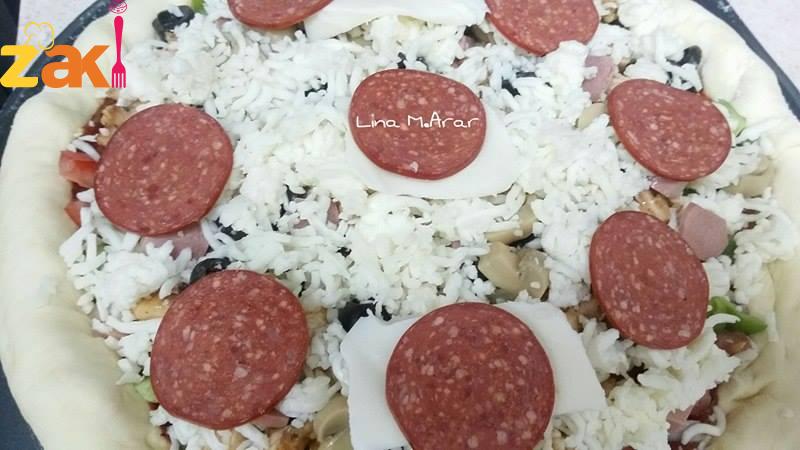 بنفرد العجينة بصينية مدهونة زيت ورشة سميد وبنحشي اطرافها ( جبنة او نقانق ) حسب الرغبة وبنسكر الجوانب منيح بنحط صوص البيتزا بعدها الخضار ( بندورة وبصل وفليفلة ) ثم رشة موزريلا ثم ( نقانق وفطر وزيتون اسود والدجاج ) وع الوجه بنحط ببرونة اذا متوفر