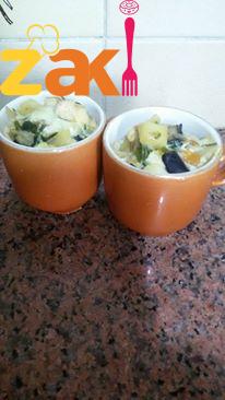 وبعدها ضفت مكعبات بطاطا مقلية وبادنجان مقلي و ضفت بيض تاخدي الدجاج وتلصقيه بفنجان القهوة وتعبيه بالحشوة وتحطي كل المقدار في كسكساس حوالى نص ساعة ملاحظة وضعت في نص كل فنجان قطعة جبنة متلتات ومن فوق رشيت جبنة موزريلا وبالصحة والعافية