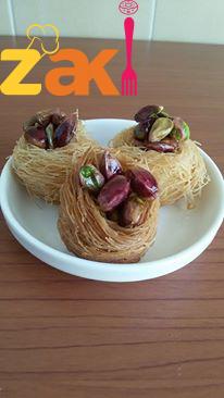 أما كنافة الفستق تلف علي الاصبع الكبير وبعدها تقلي في الزيت وتحطيها شوية عالمناديل تم تعسل وهي سخونة تم توضع حبات الفستق بعد تحميسها وتوضع في عسل طبيعي وتوضع في مكانها في الكنافة
