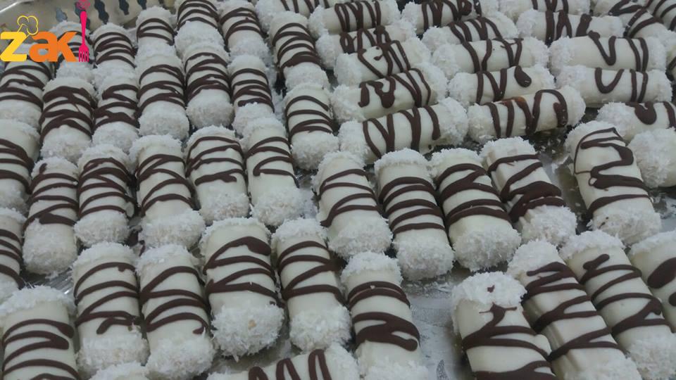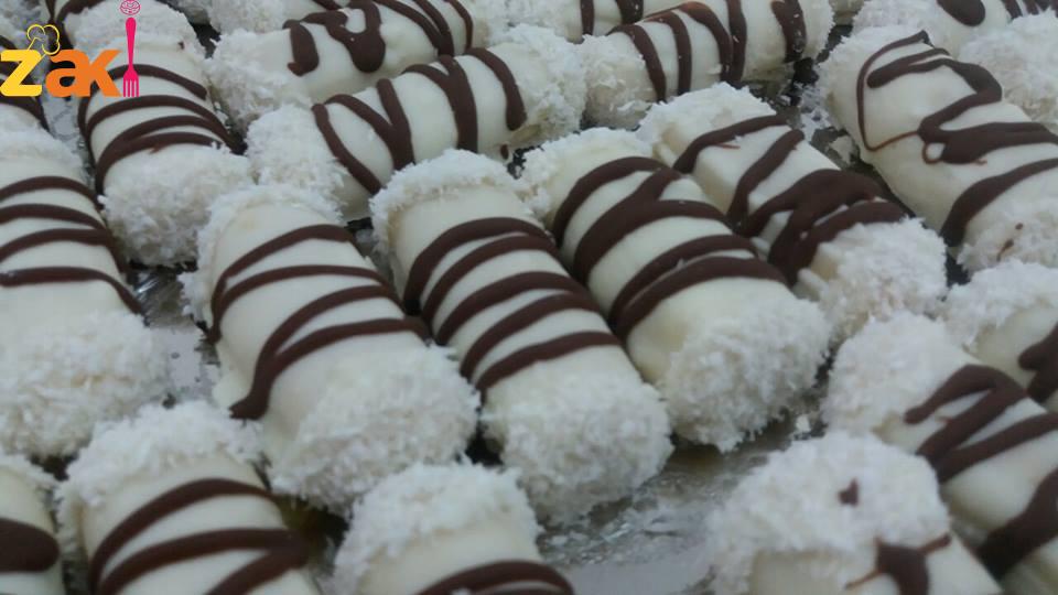 أنا بعد ما بردت حبات البسكويت, غطستها بالشكولاتة البيضاء وعلى الاطراف غطستها في جوز الهند, وعملت خطوط عليها من فوق من الشكولاتة الكاكاو.