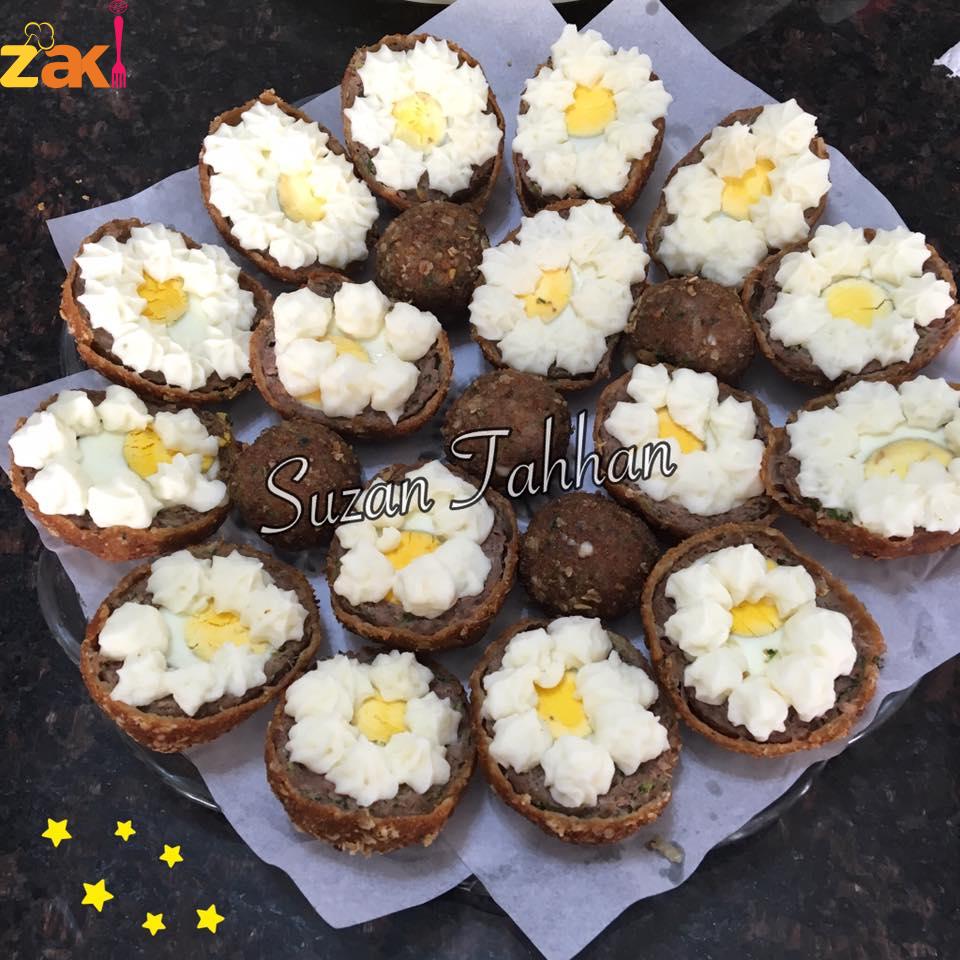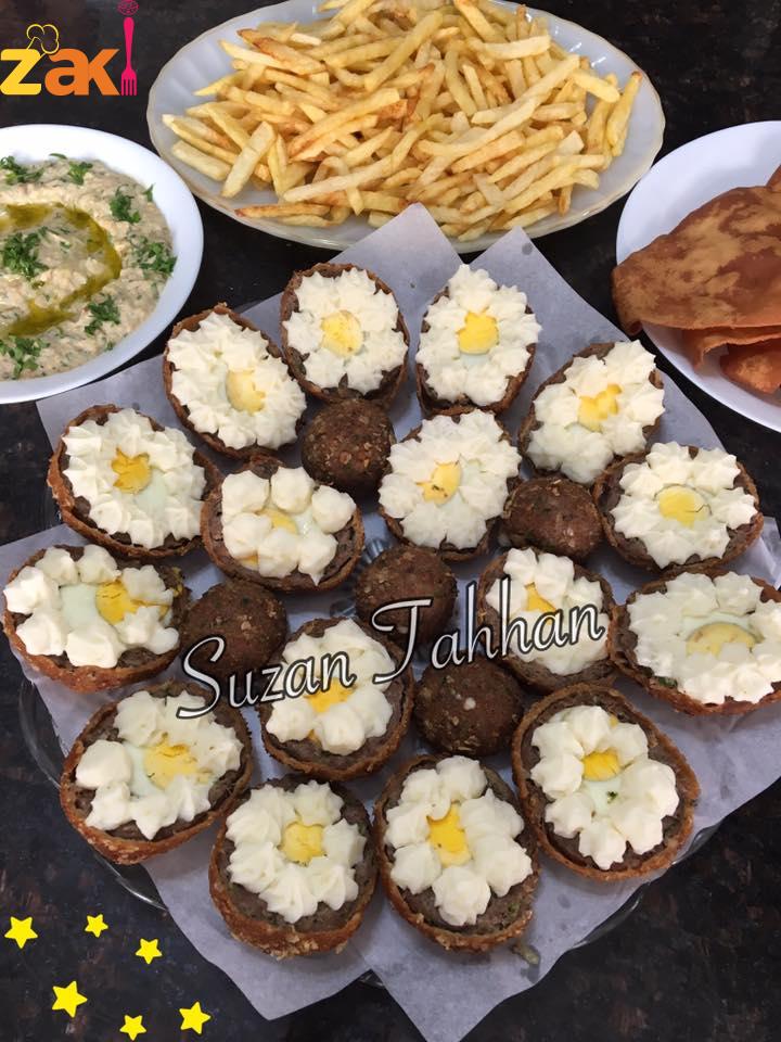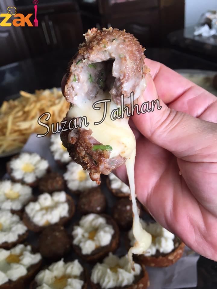 بللي يدك بالماء وافتحي كرة اللحم من الوسط (نفس طريقة حشي الكبه ) وضعي البيضه بداخلها واغلقيها جيدا مع الضغط قليلا حتى تصبح ملساء بهالطريقه ما بتفتح اثناء القلي مرريها بالدقيق ثم البيض ثم الخبز المطحون اعيديها الى البيض مرة اخرى ثم البقسماط من الضروري تكرار هالعمليه حتى ما يفتح عند القلي لما تنتهي الكميه ضعيهم بالبراد ساعه على الاقل اقليهم قلي عميق حيث تغمر الحبات بالزيت على درجه حراره منخفضه مع التقليب كل شوي لحتى يستوي اللحم وتاخذ الحبات لون وردي جميل