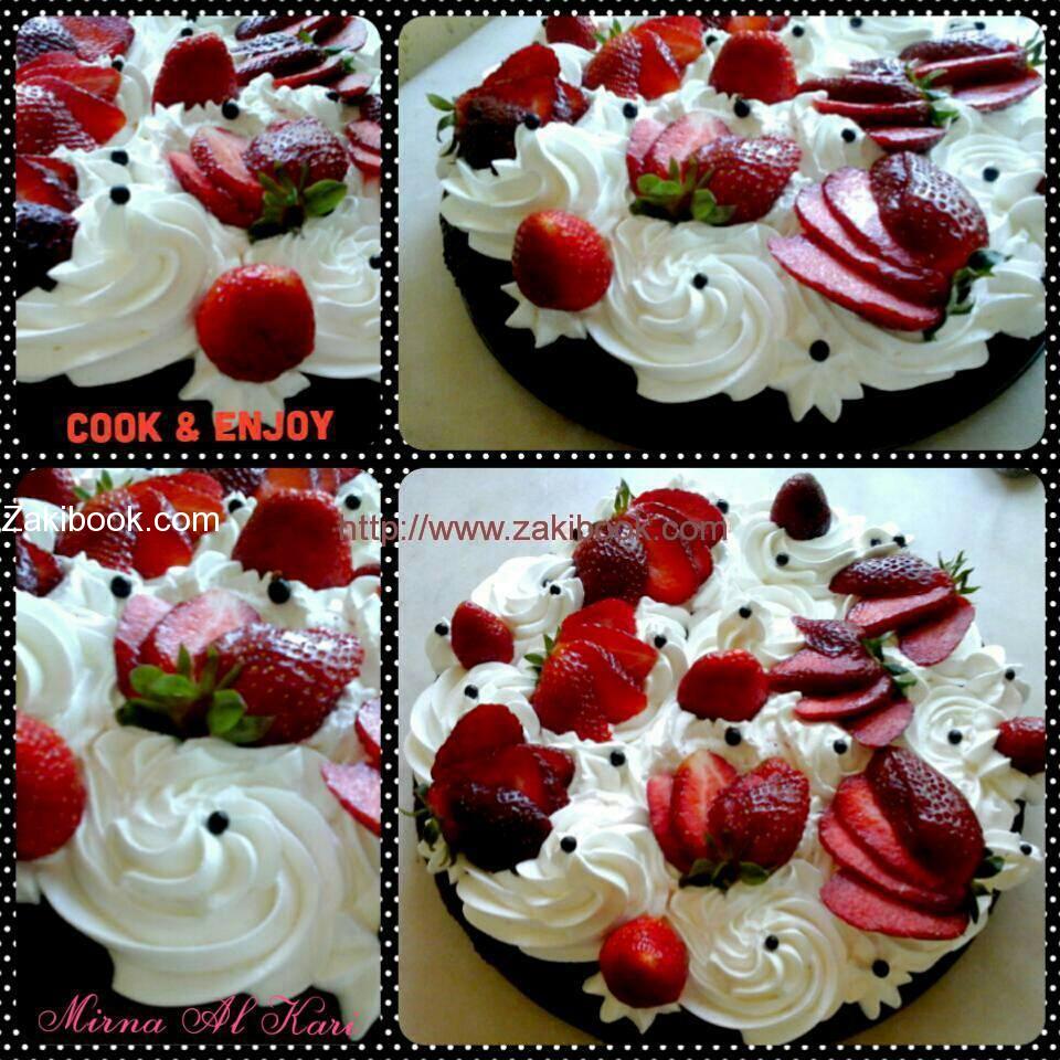 نخفق علبة كريم شانتيه بودرة مع كوب حليب بارد وملعقة سكر ناعم لمدة 5 دقائق على سرعة عالية ، ونزين به الكيكة ، مع حبات الفرولة أو ممكن حشوها وتزينها حسب الرغبة، و ألف صحة وهناء .