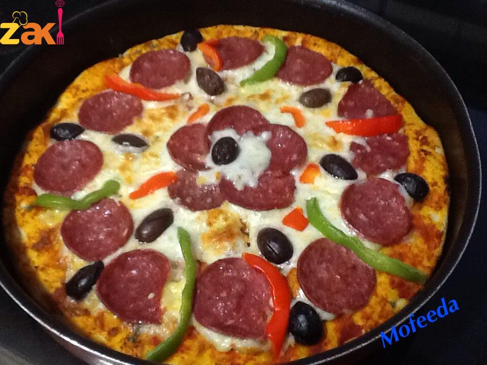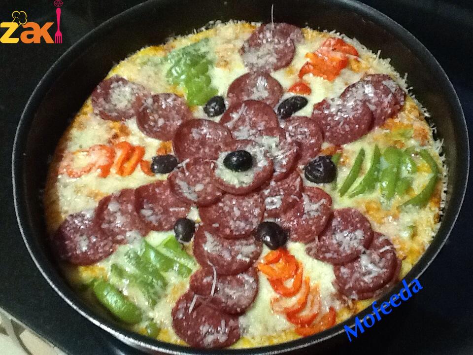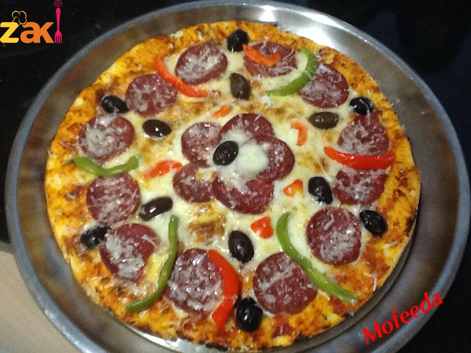 الحشو : جبنة الموزاريلا -فلفل ملون-ببيروني-زيتون اسود-صلصة بيتزا