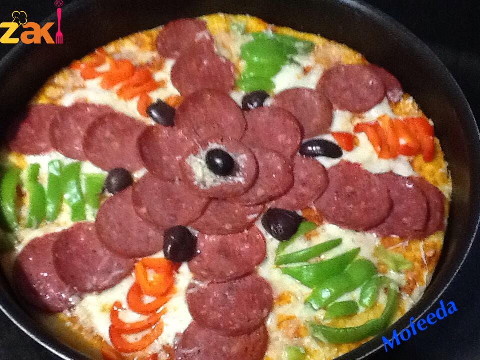 الطريقة: تفرد العجينة وتوضع صلصة البيتزا ثم جبنة الموزاريلا وتزين بباقي الحشوة حسب رغبتك بأشكال جمالية مختلفة ثم تدخل الفرن وعندما تنضج تخرج ويرش عليها بعض الجبنة وتترك قليلا بالفرن لتسيح الجبنة وتخرج وألف هنا وشفا#مفيدة#