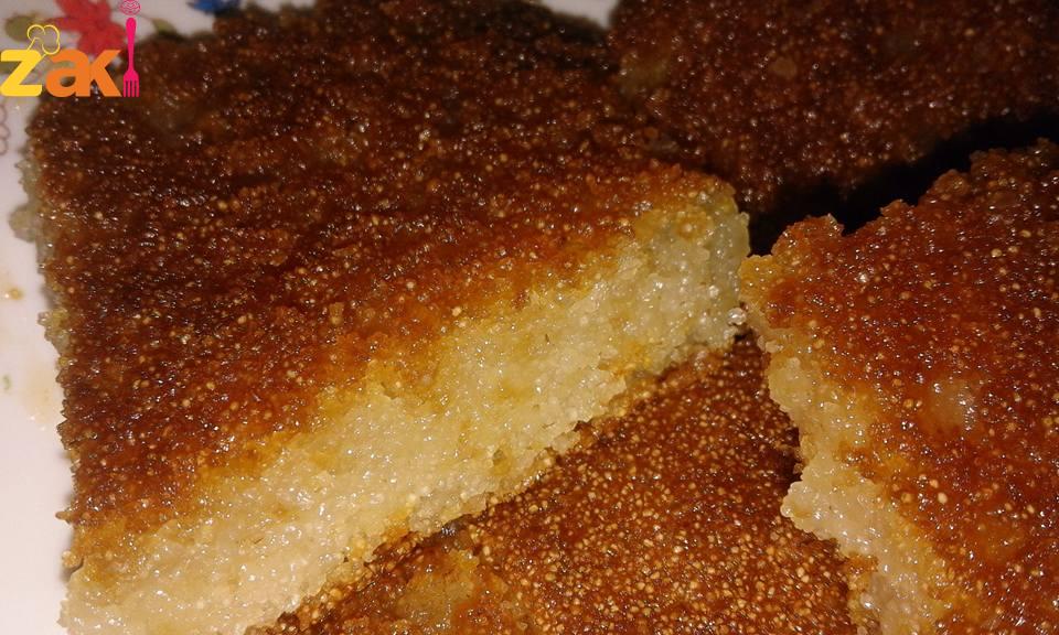 بتعجني المكونات كلها مع بعض وتفرديها ف صينيه مدهونه سمنه وع الفرن.. اول ما تطلع تسقيها بشربات سااااخن( 2كوب ماء. كوب ونص سكر. عصير نصف ليمونه )