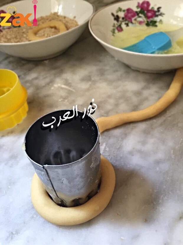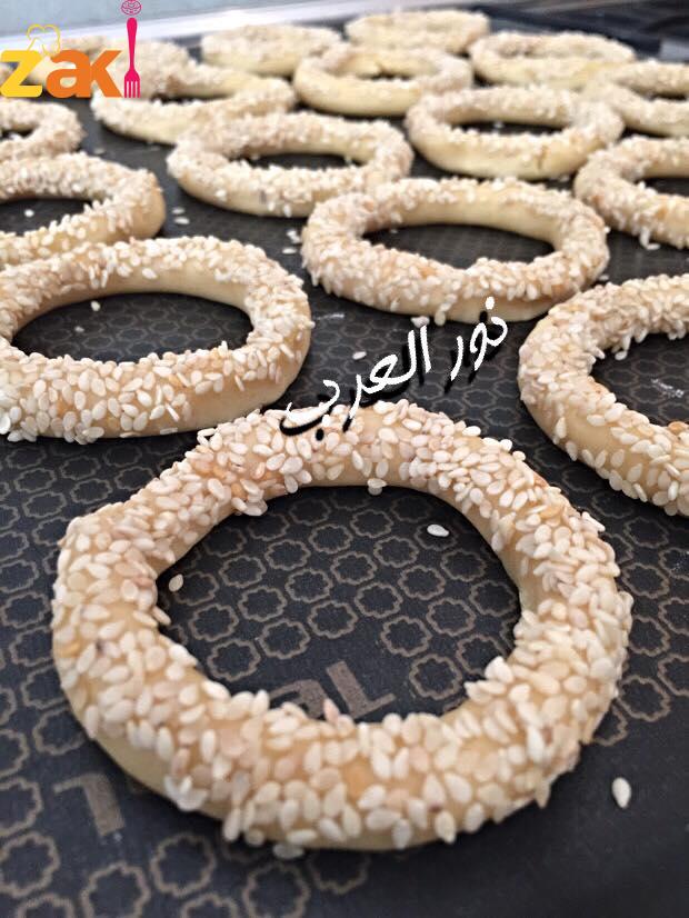 ناخذ بالقطعة ونرش دقيق تحتها حتى ماتلصق ونبرمها رقيقة ونلفها حول شي دائري صغير مثل بيالة الشاهي الصغيرة حتى تتحصلي على نفس الحجم وكل ماكانت صغيرة تكون احلى وندهنها ببياض البيض من السطح العلوي ونرميها بالسمسم وعلى فرن ساخن من تحت وفوق درجة 200 ماياخذ وقت بالفرن